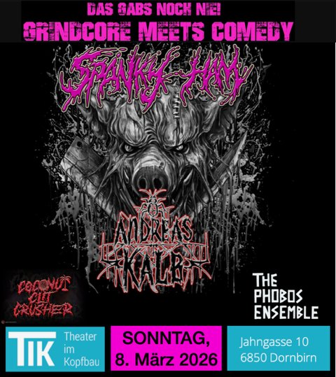 Wenn Der Wahnsinn Frikadellen verteilt Wir zerschmettern die Genregrenzen: GRINDCORE MEETS COMEDY! SCHNELLER als dein Herzschlag. LAUTER als jeder Witz. BRUTALER als dein letztes Date.MOSH-PIT ODER Lachkrampf? Hör auf zu raten! Die einzige Möglichkeit, die Wahrheit zu erfahren: SCHAU VORBEI! ACHTUNG, HOCHEXPLOSIV: Kann Spuren von Groovy-Goregrind, Slampornality, Wirtshauslyrik und akutem Zwerchfellkater enthalten. SPANKY HAM: Der Groovy-Goregrind vom Spieß!Vergiss alles, was… ...