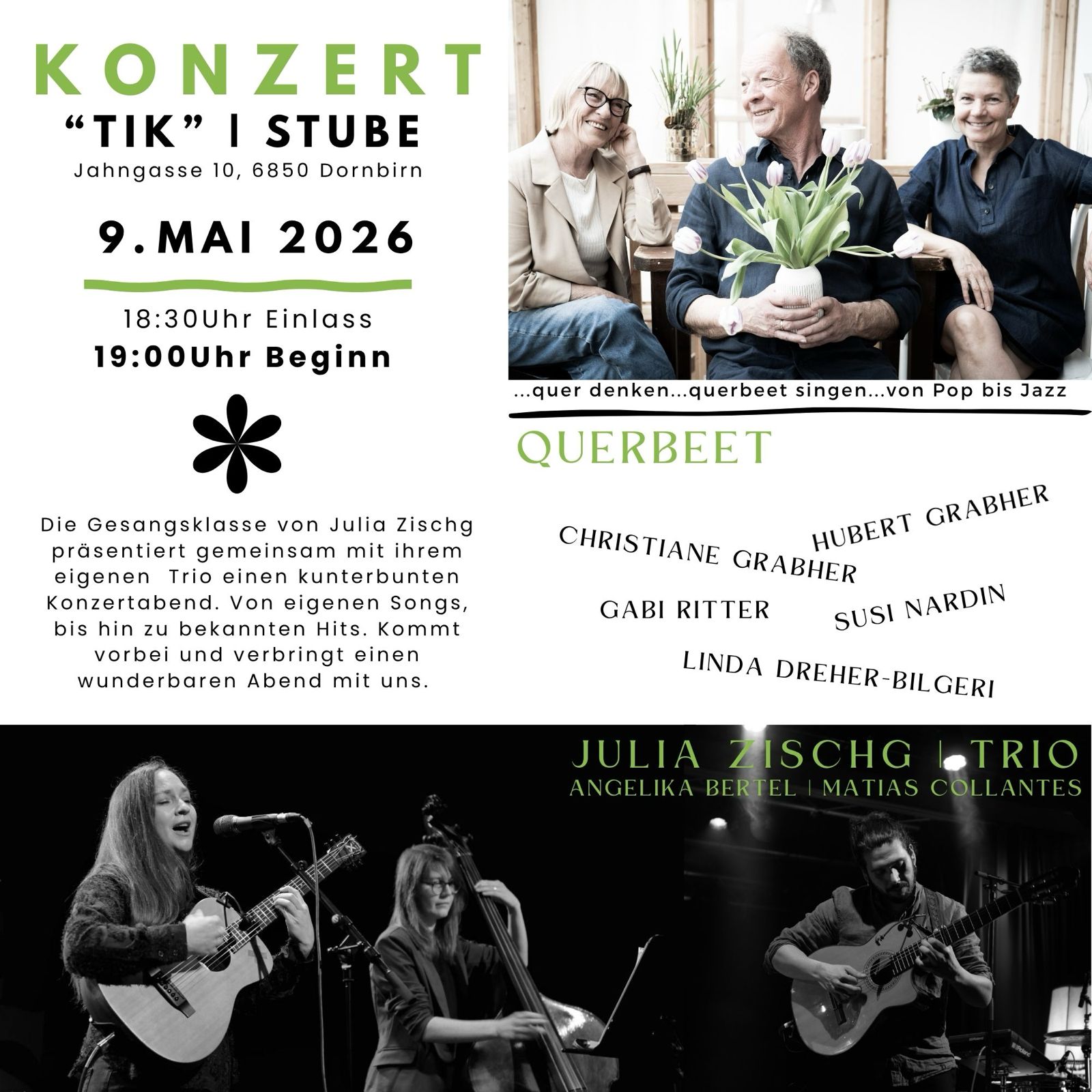 Die Gesangsklasse von Julia Zischg präsentiert gemeinsam mit ihrem eigenen Trio einen kunterbunten Konzertabend. Von eigenen Songs, bis hin zu bekannten Hits. Kommt vorbei und verbringt einen wunderbaren Abend mit uns. ...